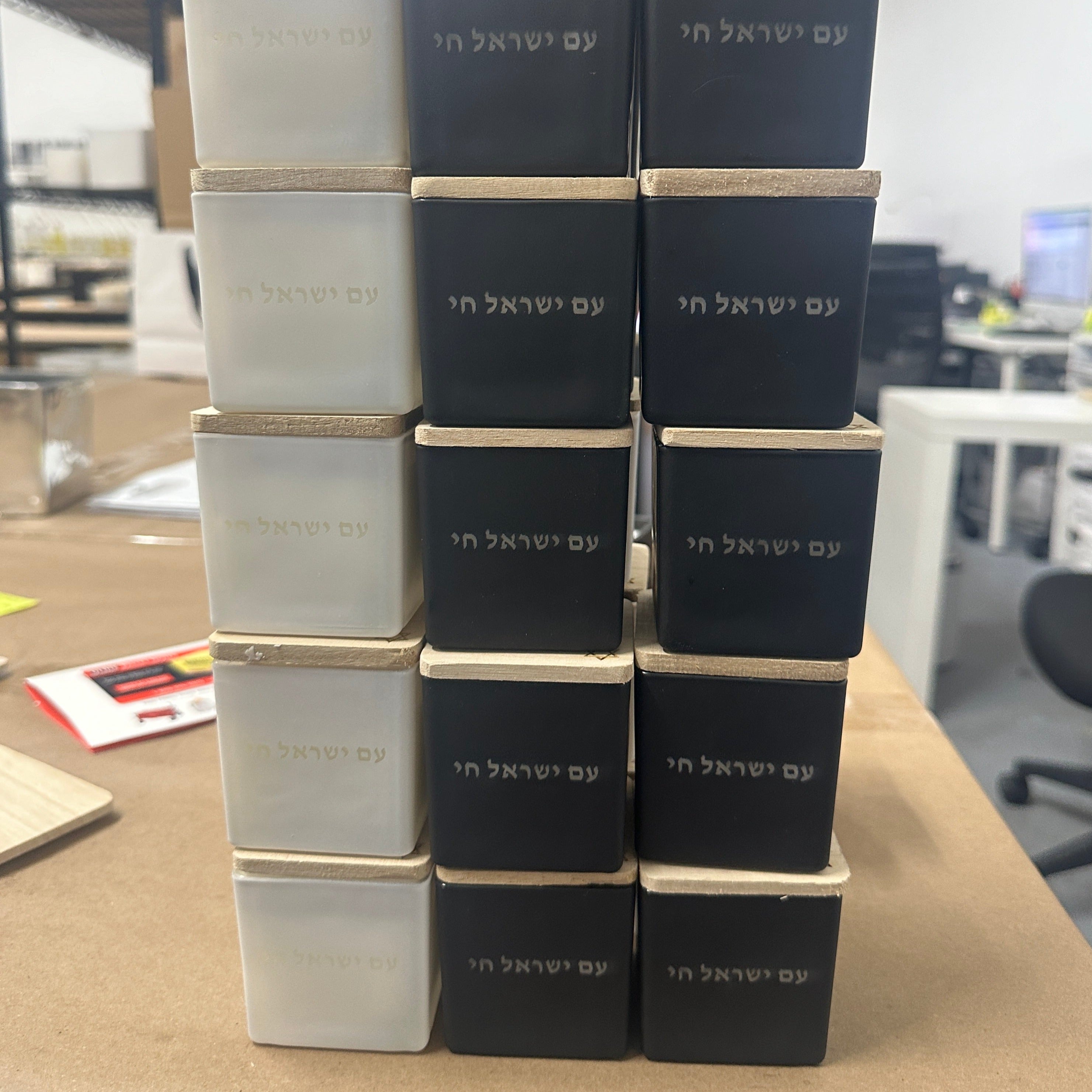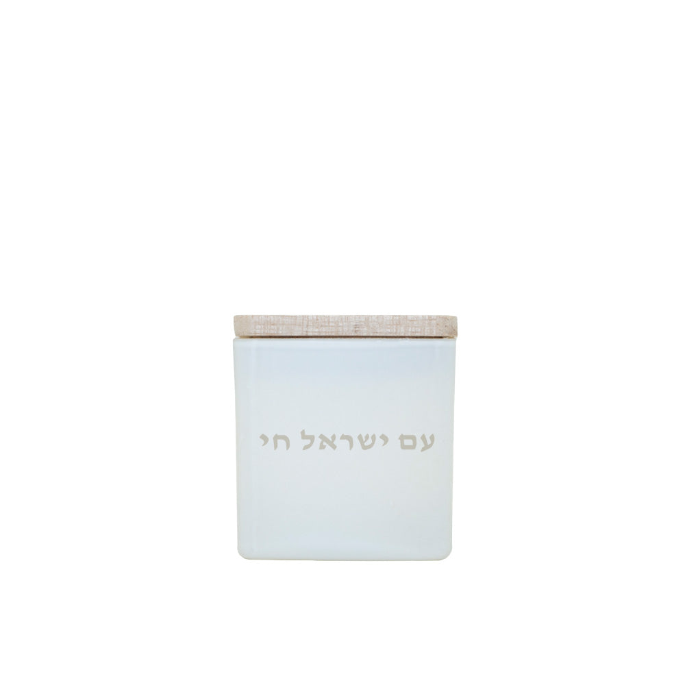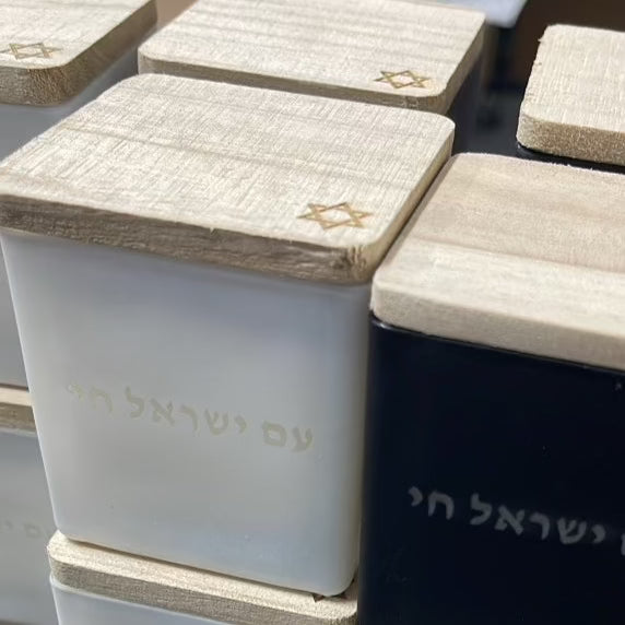 Design details: On the front of the candle, "Am Israel Chai" is engraved in Hebrew. The star of david is engraved on the bottom right corner of the top lid.
