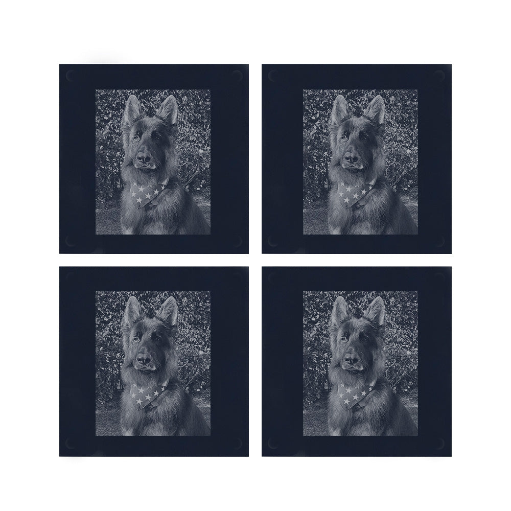 Our custom pet coasters (4.5 x 4.5 x 0.2 inches) are glass-coated in your choice of black or white, with your pet’s photo expertly engraved right onto the surface.