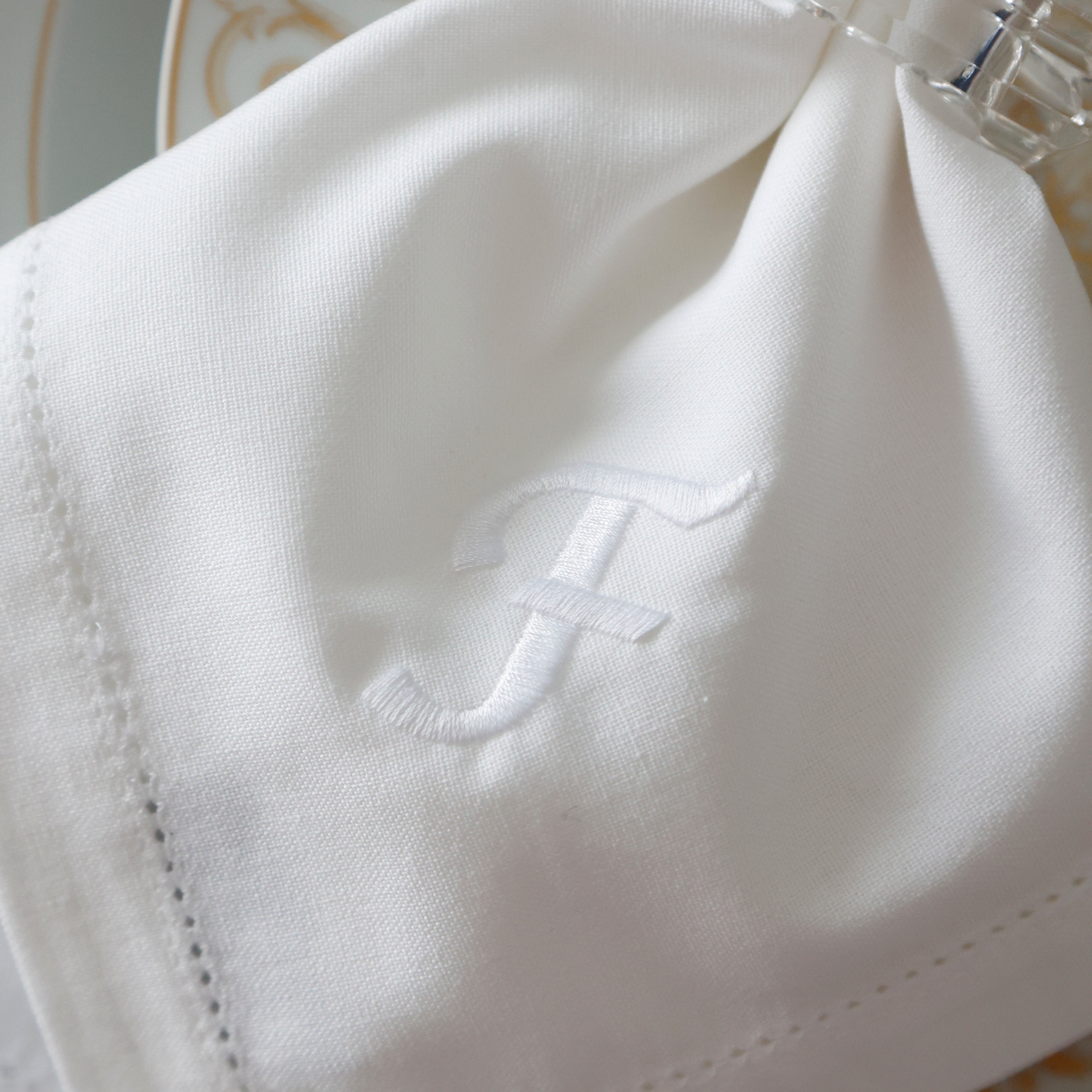 4 Napkins: 50 cm x 50 cm (approx. 19.7" x 19.7") with a single monogram in cursive font.