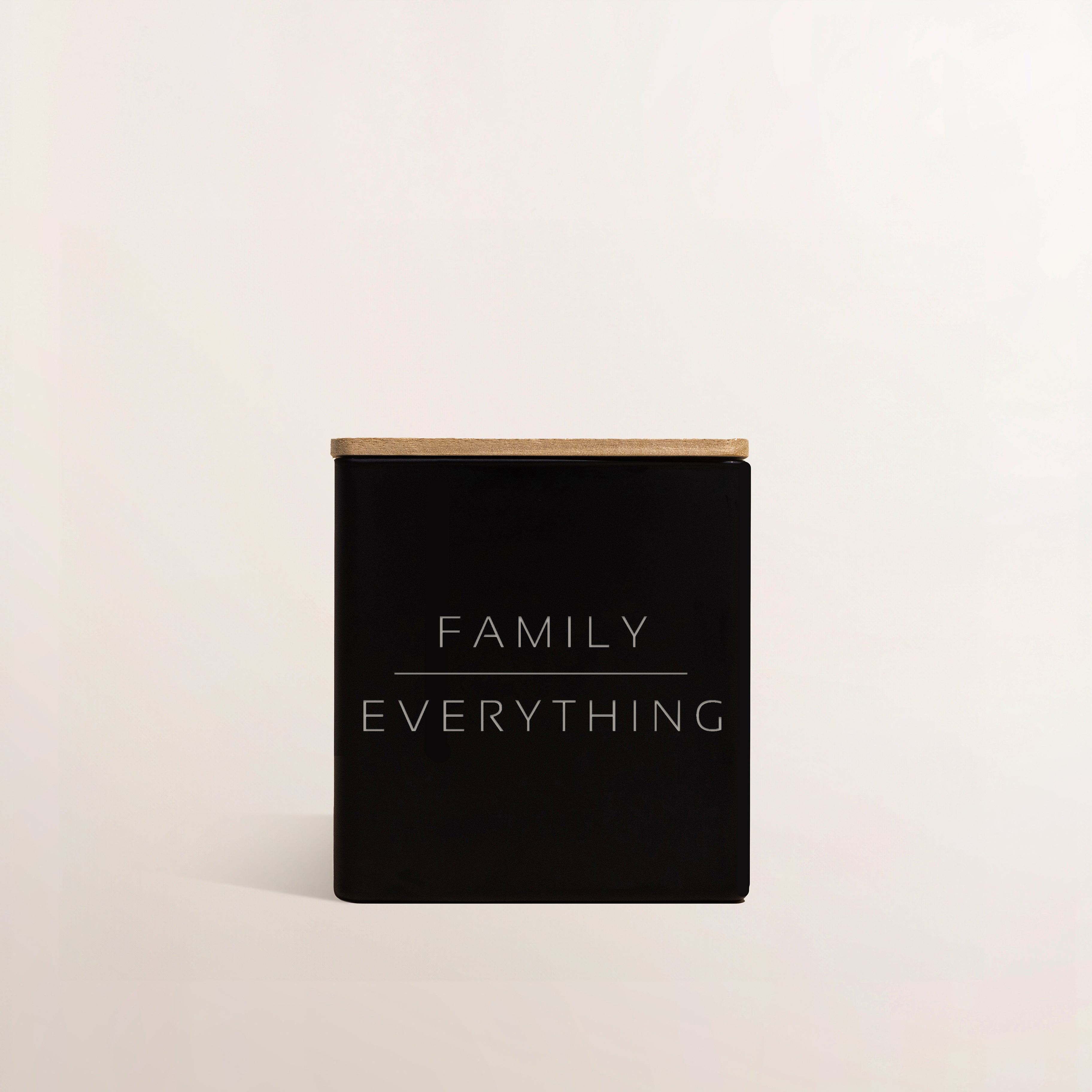 The design is engraved directly onto the front of the glass jar with “FAMILY” on the top line, a horizontal line underneath, and “EVERYTHING” on the second line — simple, powerful, and timeless.