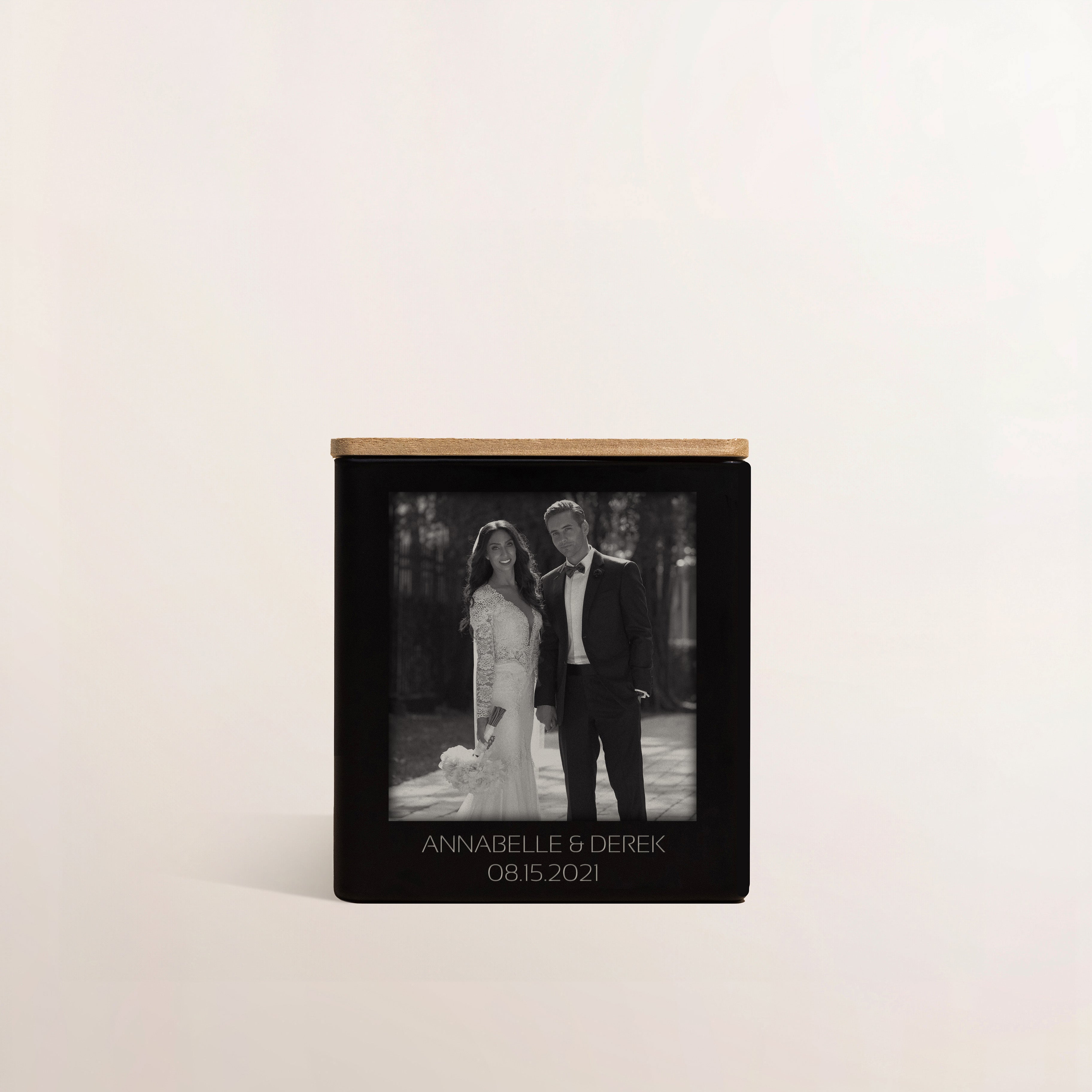 A custom message on the outside of the wooden lid is complimentary—use it to something meaningful for the couple like a phrase, city, joke, etc.