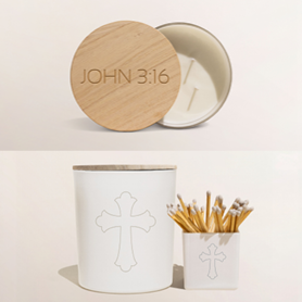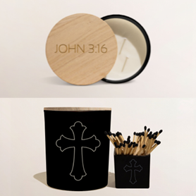The front of the candle and matches are engraved with a cross, while the lid is etched with John 3:16—a verse that reminds us of God’s everlasting love: “For God so loved the world that He gave His one and only Son, that whoever believes in Him shall not perish but have eternal life.”