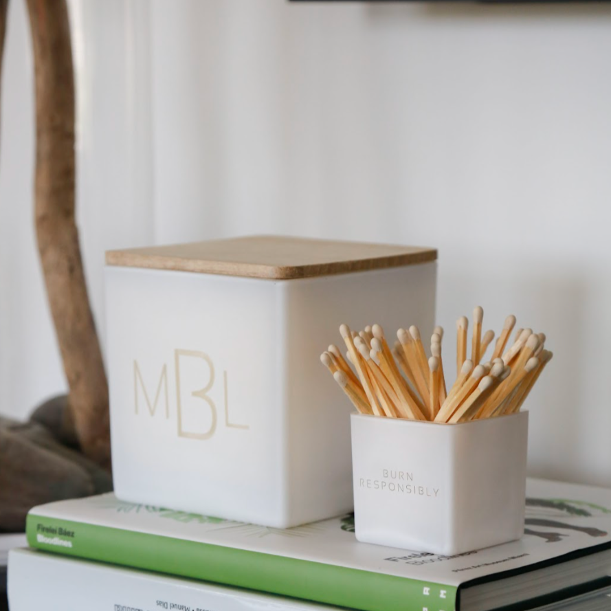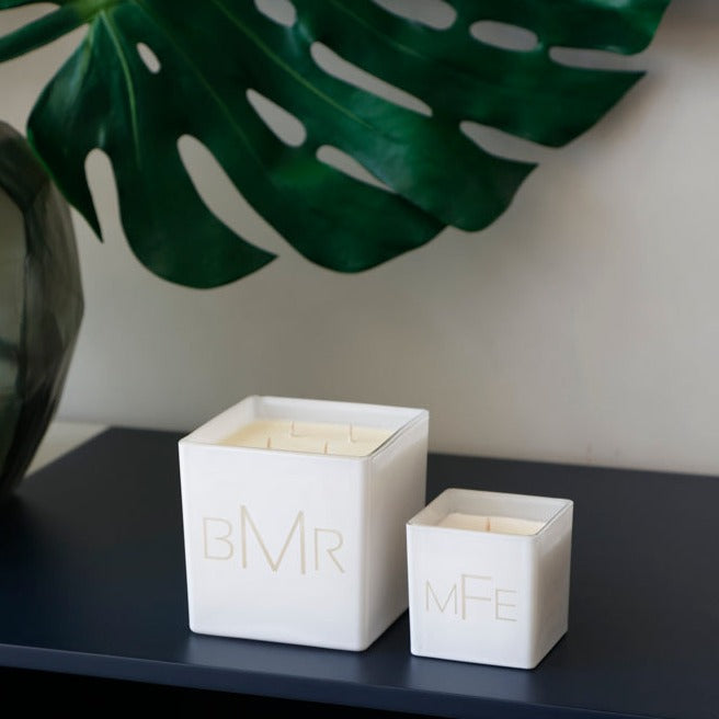 Our Classic Monogram Candle features the traditional American three-letter monogram layout: the last name initial goes in the center, slightly larger, with first name initials on either side. For a personal touch, use your own initials (first–last–middle). Gifting for a couple? Place the shared last name in the center and each partner’s first initial on the sides. It’s a subtle nod to heritage, love, and personal style—clean, classic, and always in good taste.
