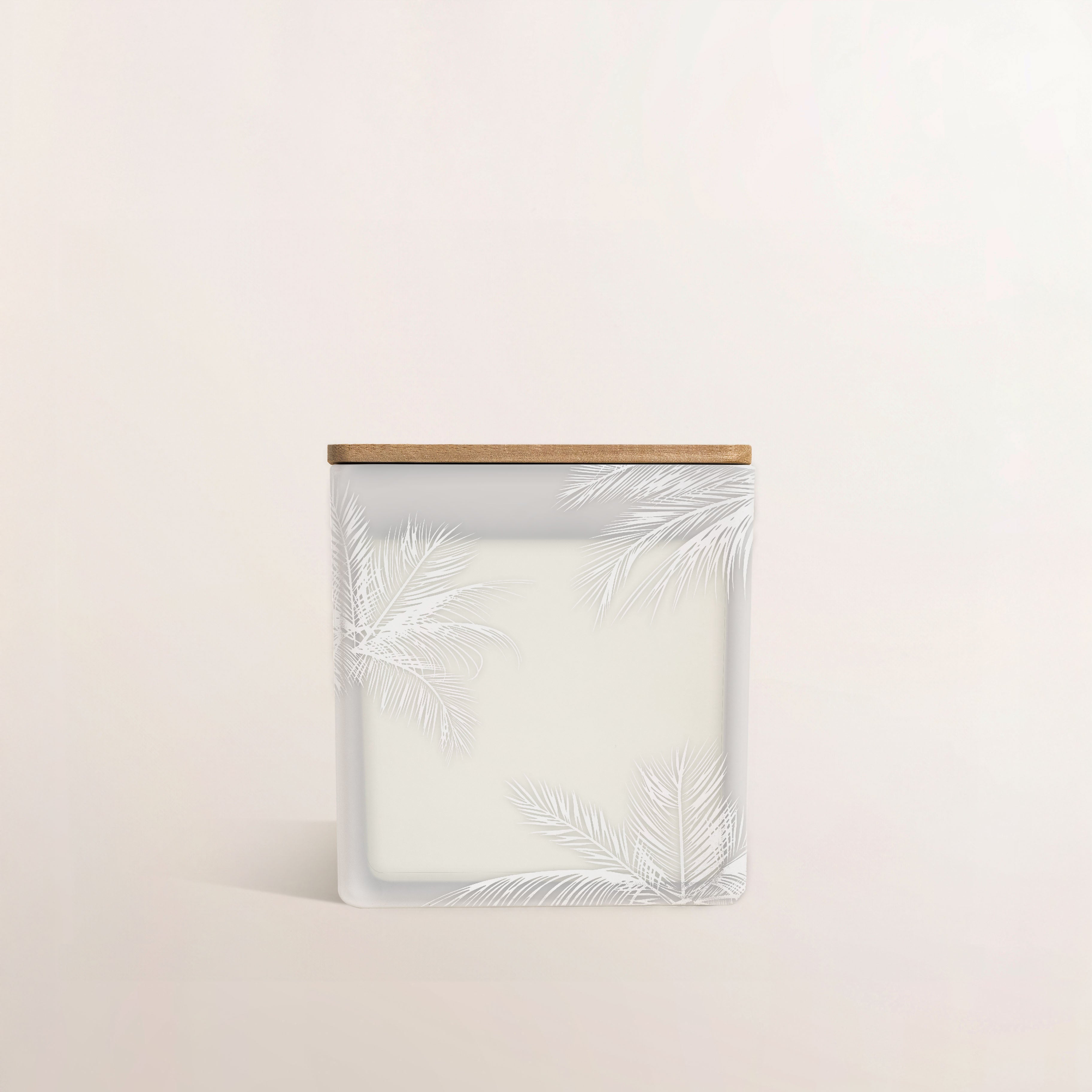 The palm pattern wraps around the entire glass jar, but here’s what makes it special: the palm trees remain the color of the jar, and the background is lifted off — a unique, inverted engraving technique that creates a soft contrast. As the candle burns, the shadows glow gently through the glass, just like reflections on the water.