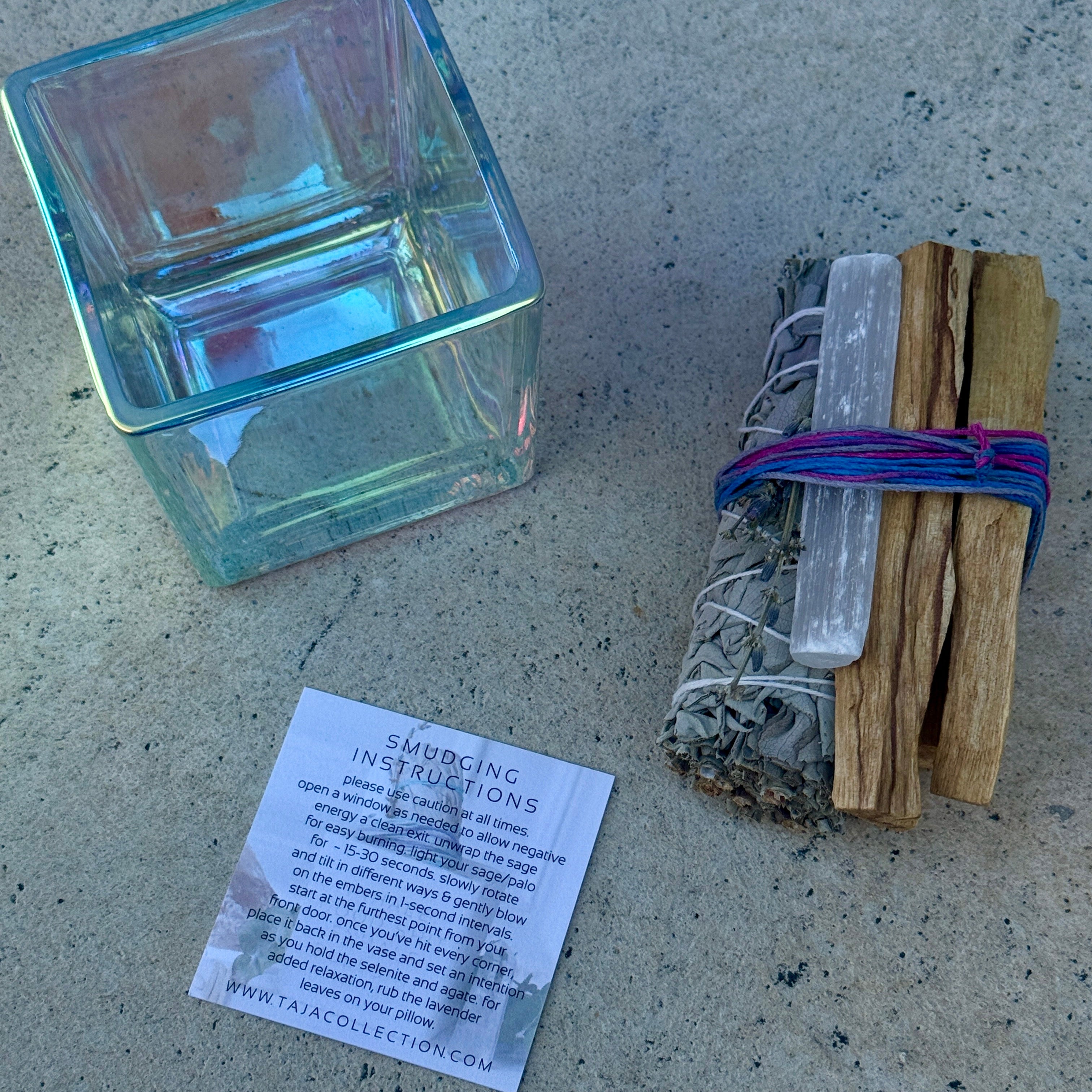 Packaged in a classic size 3.2 x 3.2 inch iridescent vase—this kit has everything you need to refresh your environment and set positive intentions. Inside, you’ll find a bundle of smudging essentials wrapped in cotton string, plus easy-to-follow instructions to guide your ritual.
