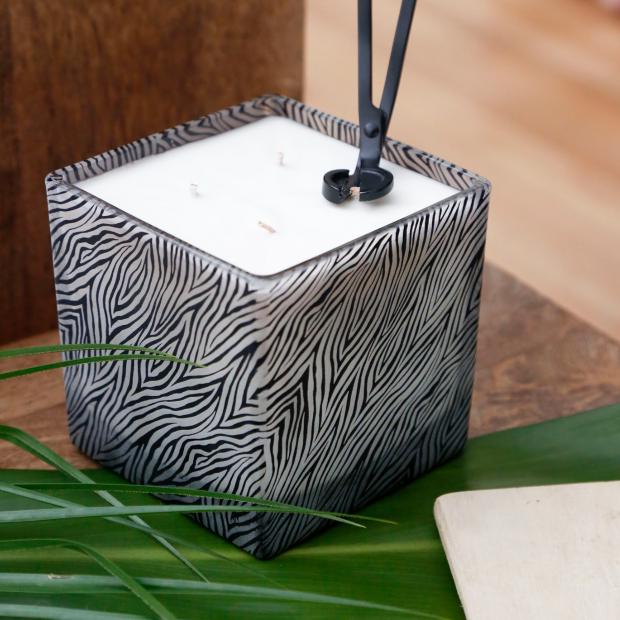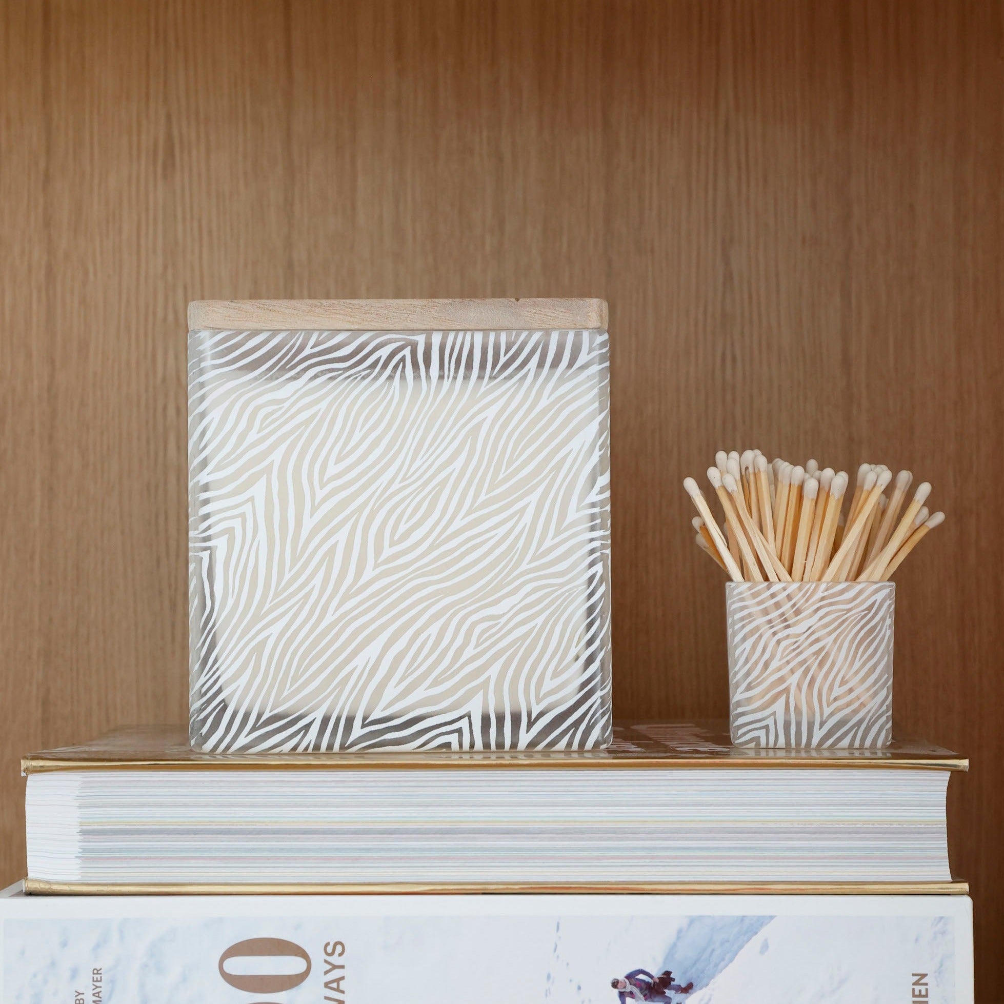 This candle features a bold zebra pattern engraved on all four sides of the glass jar — it wraps all the way around for a statement look that’s perfect on a vanity, shelf, or coffee table.
